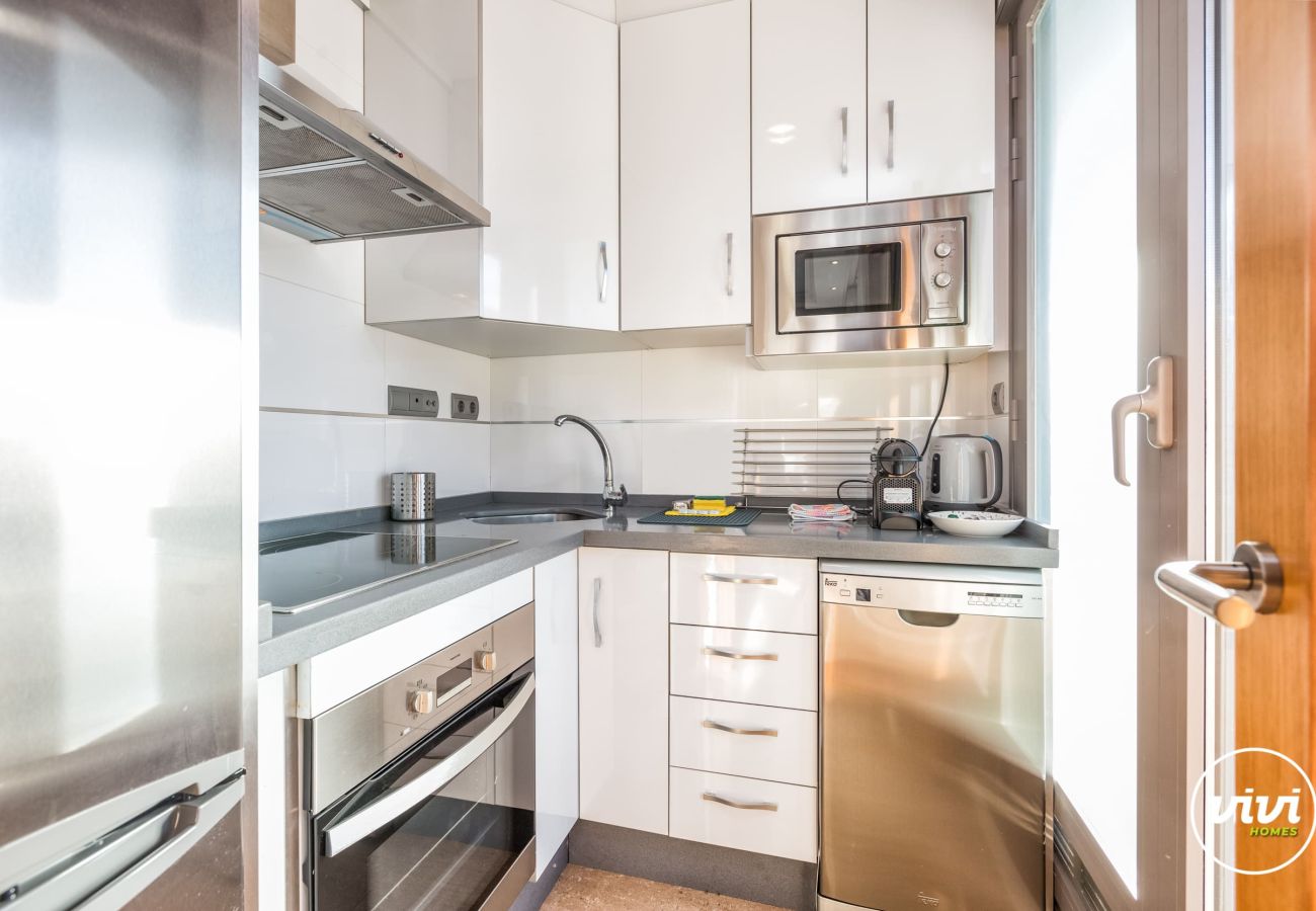 El apartamento cuenta con una cocina totalmente equipada y aire acondicionado.