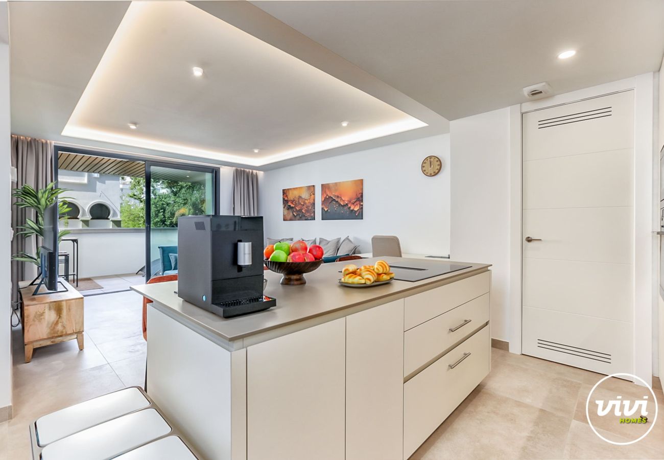Pase a la terraza para disfrutar de la luz del sol y la sombra. Comparta una comida al aire libre en el jardín privado cercado con una hermosa vista al mar. En el interior, el apartamento ofrece comodidades modernas y una cocina totalmente equipada con todo, desde una cafetera hasta un lavavajillas y una lavadora.