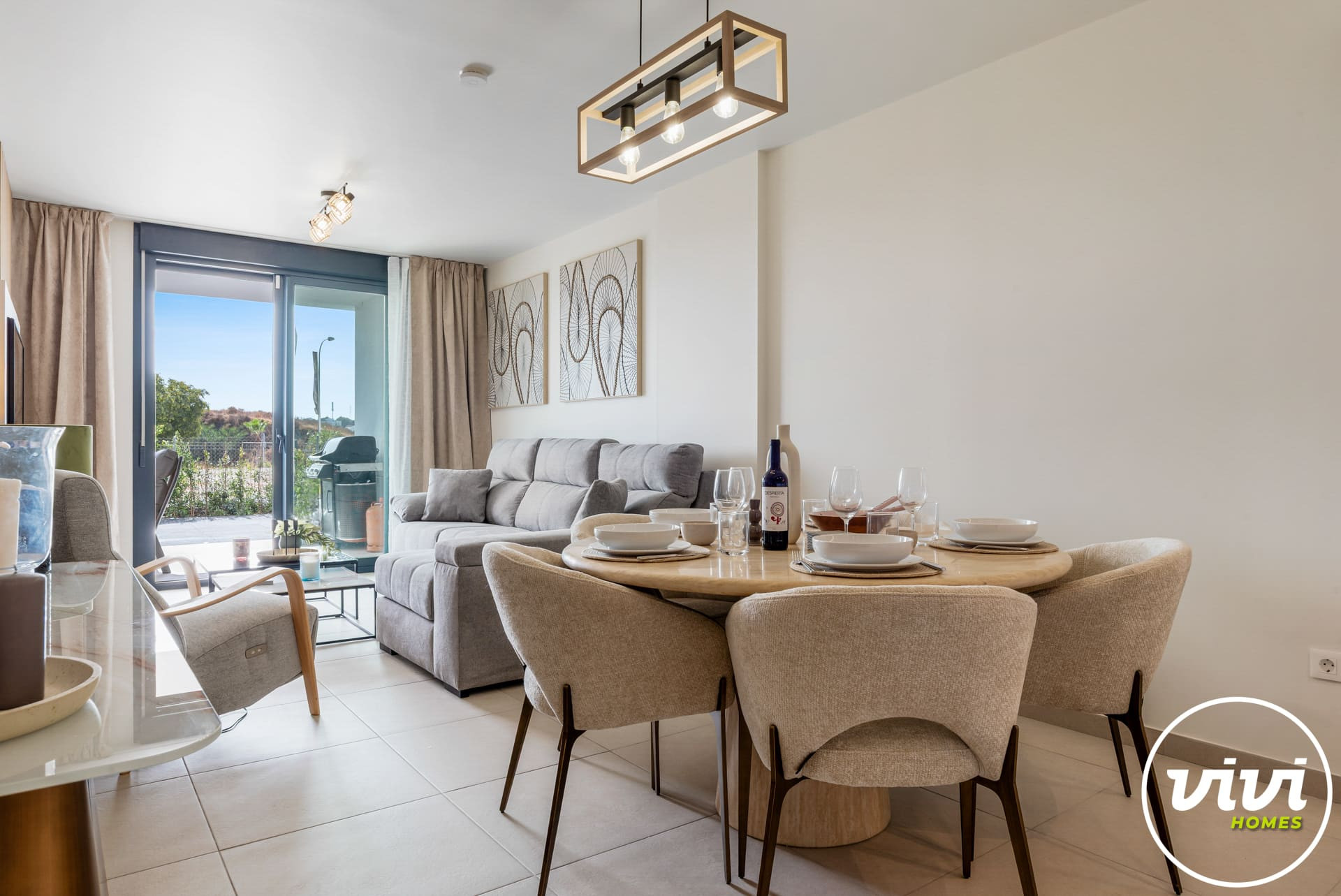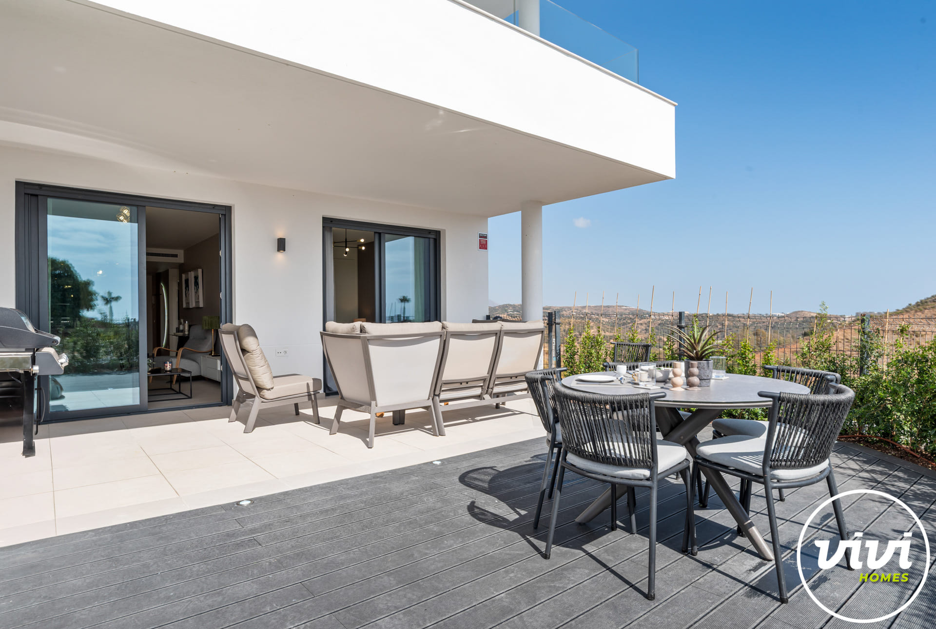 El área de estar conduce directamente a una generosa terraza privada, con zona de comedor y un acogedor salón: el lugar ideal para relajarse después de un día explorando la Costa del Sol. El dormitorio principal tiene puertas corredizas que se abren directamente a la terraza, proporcionando luz natural y fácil acceso al espacio exterior.