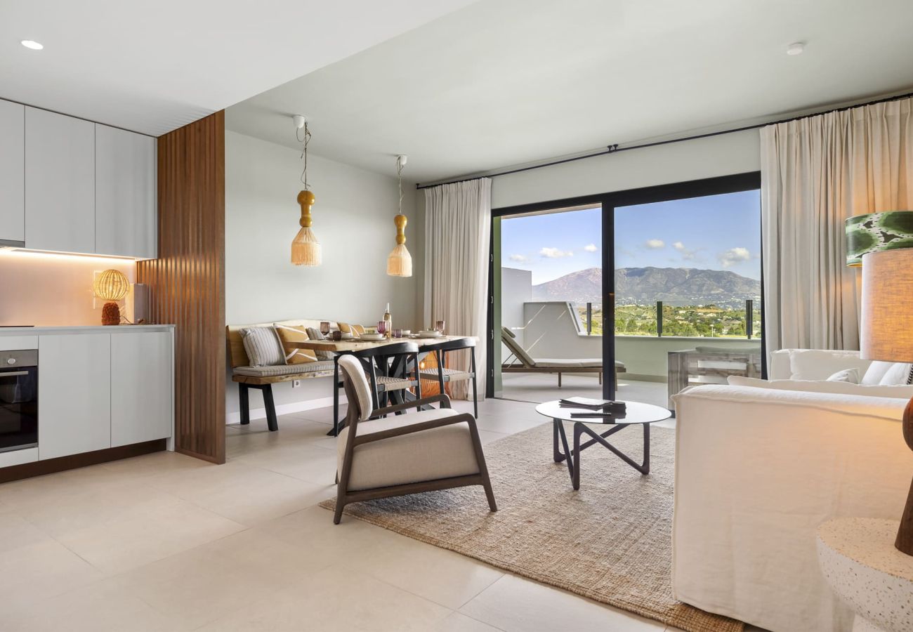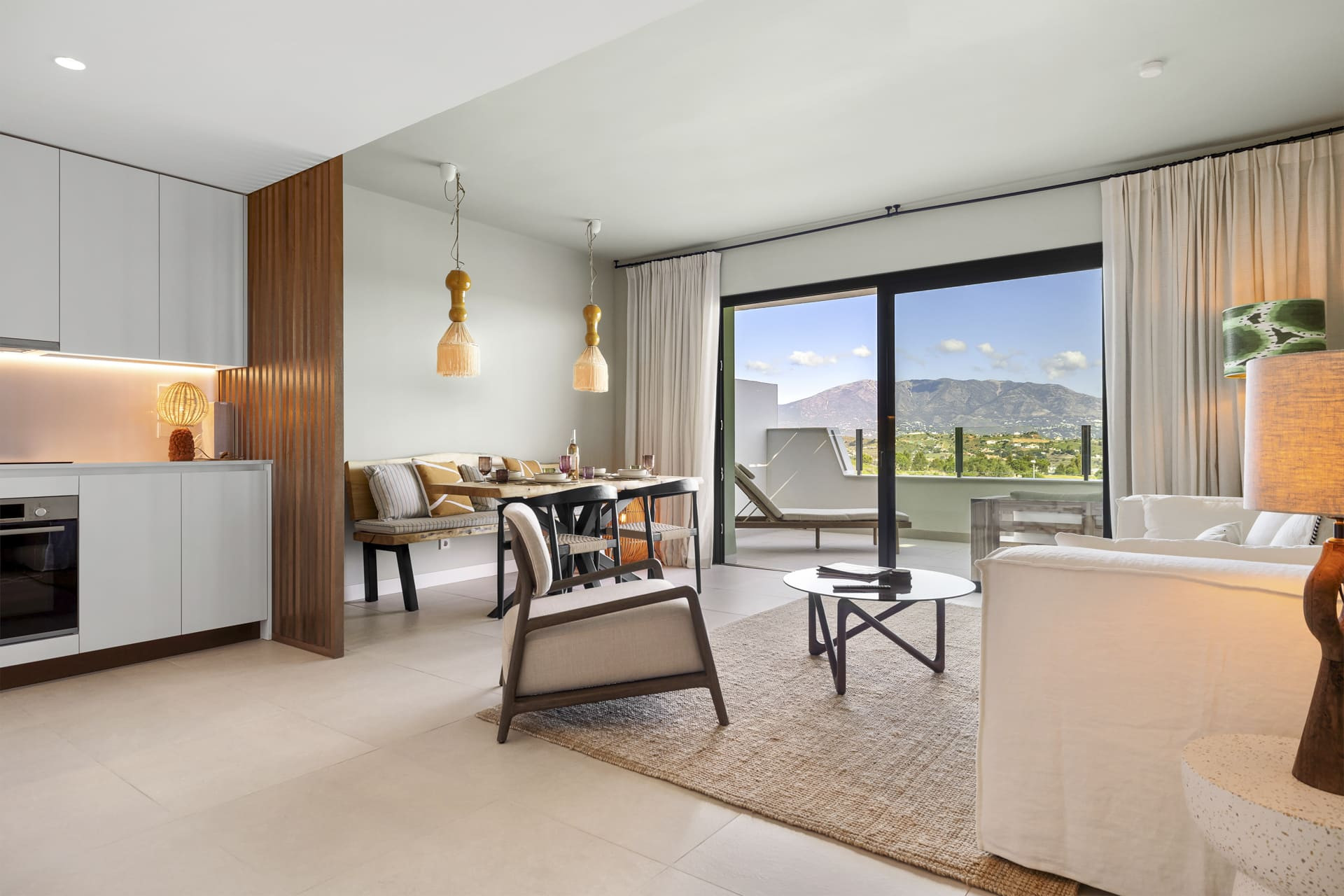 El amplio salón se abre a una gran terraza privada, con una zona de comedor y un acogedor conjunto de salón: el lugar perfecto para relajarse después de un día explorando la Costa del Sol. Desde la terraza, una escalera conduce a un hermoso jardín donde podrá disfrutar del entorno tranquilo.