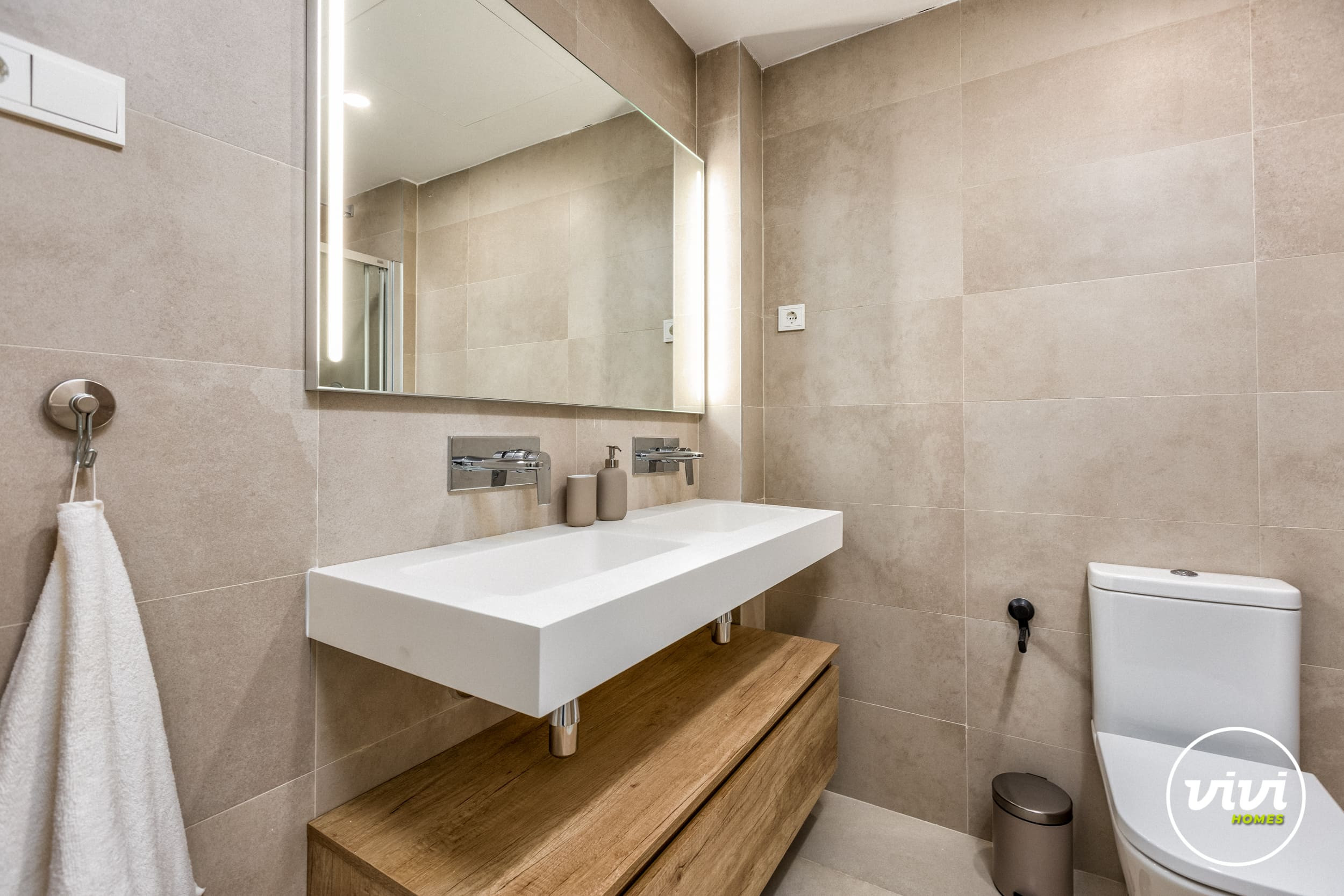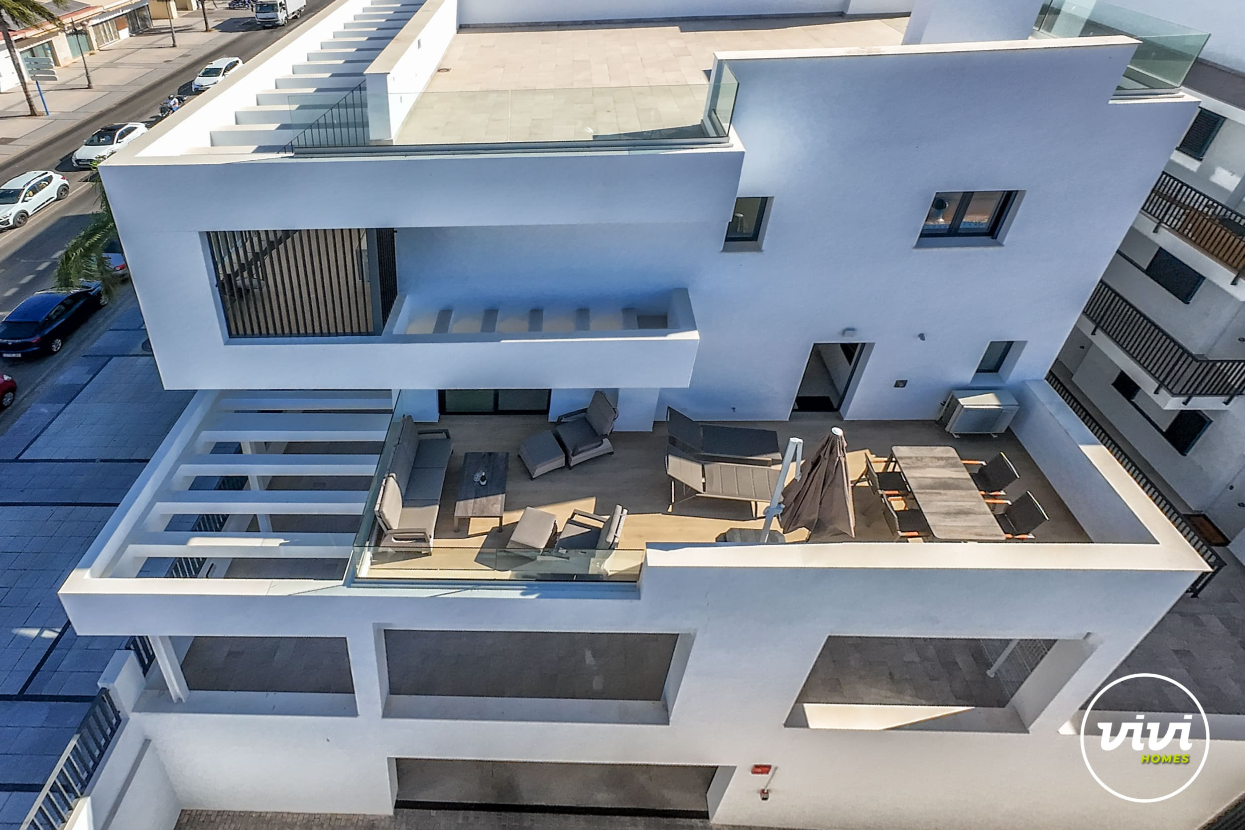 The accommodation is equipped with the following items: lift, garden, fenced garden, 35 m² terrace, hair dryer, heat pump, air conditioning throughout the house, communal swimming pool, garage the same building, TV.