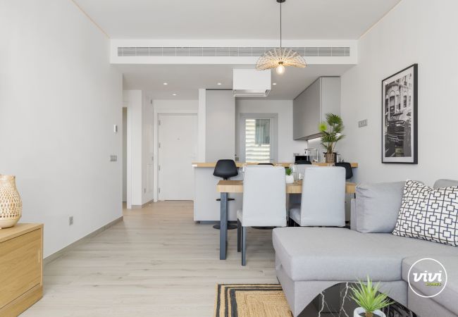Het interieur is ongelooflijk modern en stijlvol. De woonkamer is gezellig, met een flatscreen en comfortabele meubels, perfect voor een avondje thuis na een lange dag vol ontdekkingen. Het grote, overdekte balkon heeft een prachtige lounge, de ideale plek om te ontspannen. Het appartement heeft een volledig uitgeruste keuken en beschikt over airconditioning, waardoor je je op elk moment van het jaar perfect zal voelen.